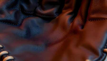 A close-up view reveals the intricate texture and rich color of brown leather, highlighting its beautiful stitching and natural imperfections, illuminated by soft lighting.
