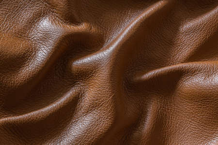 Detailed macro of wrinkled brown leather fabric, showing its rich, textured surface with natural grains and a luxurious finish.