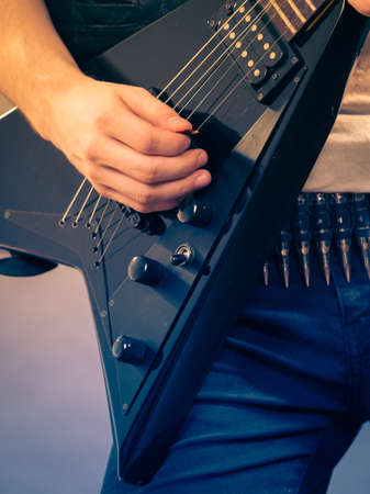 Male hands with electric guitar. Close up, part body adult person is holding instrument and playing. Hobby, music concept