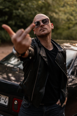 Sexy bald bearded man in fashion sunglasses in stylish leather jacket shows indecent gesture at camera. Cool brutal guy bully stands next to modern black car outdoors.