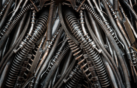 Handicraft old metal artwork from used spare parts of car or motorbike. Closuep textured background