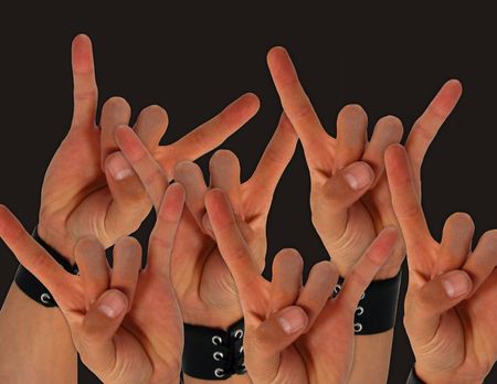 hand with a goat sign of a dancing fan from the crowd at a rock concert of a popular band. silhouette of a musician on stage in haze. music festival banner