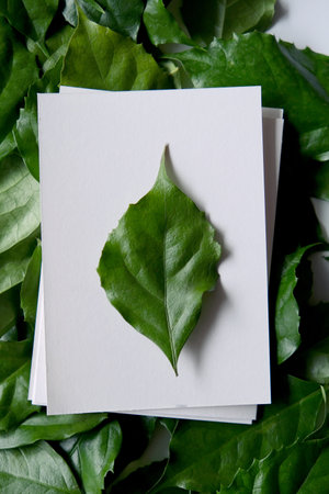 Creative layout made of green leaves with white paper card. Flat lay. Nature concept.