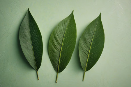 Rich green leaves are displayed in a close-up view, highlighting their smooth texture and vibrant colors under soft lighting, creating an inviting and serene atmosphere.