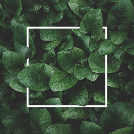 Perfect natural background made of fresh leaves pattern. Dark and moody feel. Top view. Copy space.