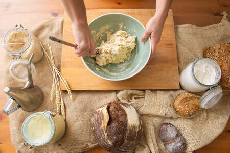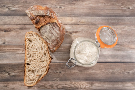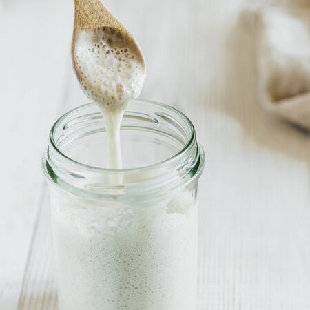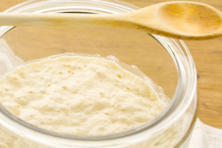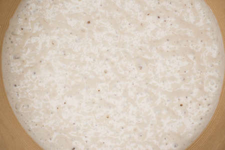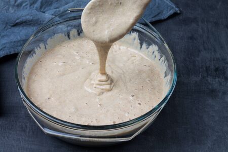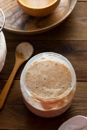 Starter sourdough. Baking homemade bread with wild sourdough over wooden background.