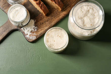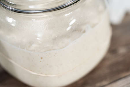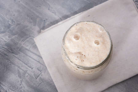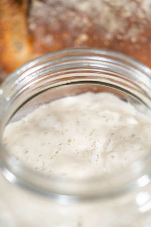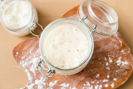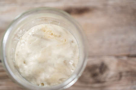 Glass jar with dough leaven. Preparing yeast dough for bread, buns, pastries or pizza, close up, top view. Cooking process