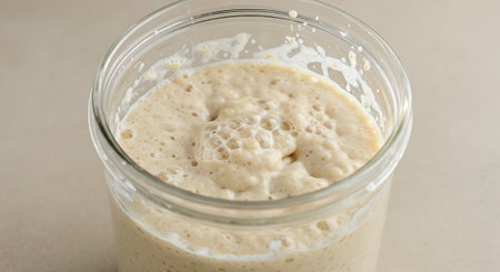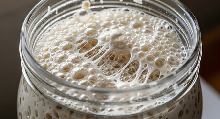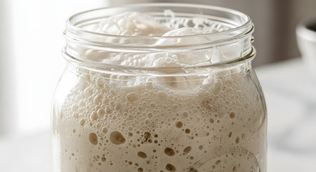 a glass jar of sourdough starter, with a bubbling and foamy fermentation, created with generative ai