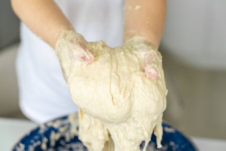 Close-up of the hands of a woman preparing traditional bread on a wooden table