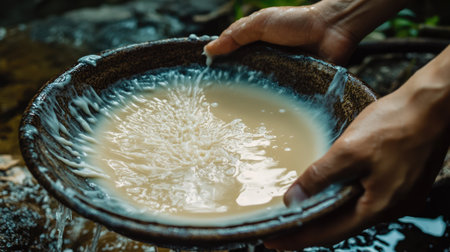 A close-up image showcasing hands gently holding a rustic bowl filled with water, creating a beautiful splash effect against a natural backdrop.