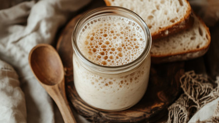 This image showcases a bubbly sourdough starter in a glass jar, accompanied by wooden spoons and slices of artisan bread, highlighting homemade baking and fermentation techniques.