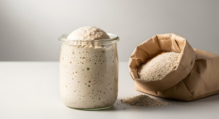 An active and bubbly sourdough starter, a key ingredient for artisan bread, fermenting in a glass jar next to a paper bag of flour on a clean, minimalist background.