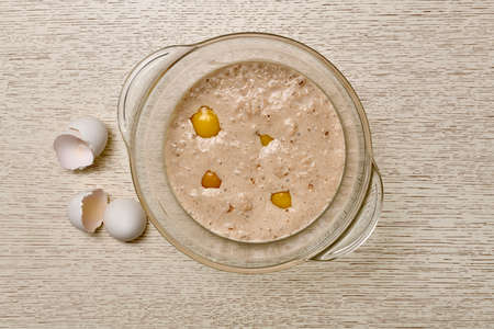 The stage of adding eggs to the yeast diluted in milk, in a glass transparent pan with handles. White egg halves of the shell, next to the left. The process of preparing the dough. On a countertop.