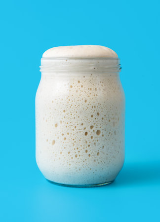 Glass jar full of sourdough starter, minimalist on a blue background. Fermented sourdough starter ready for baking