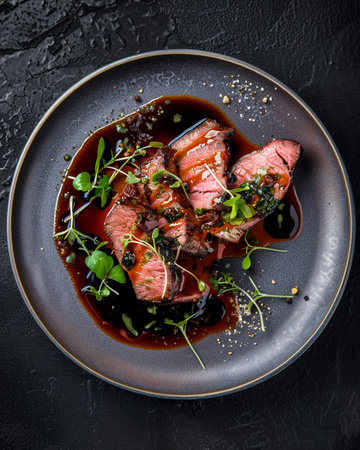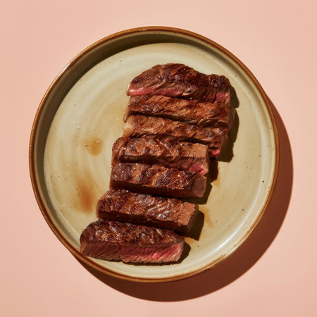 A beautiful presentation of grilled steak slices showcasing juicy pink meat and a perfectly seared crust. Ideal for culinary projects, gourmet menus, and food photography.