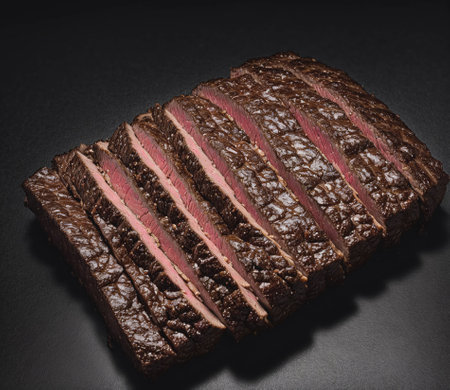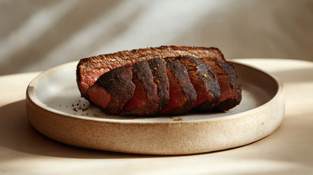 Thick slices of medium-rare beef brisket rest on a minimalist ceramic plate, with a perfectly seared crust and juicy, reddish interior. Ideal for food styling, gourmet menus, or illustrating premium cuts of meat.