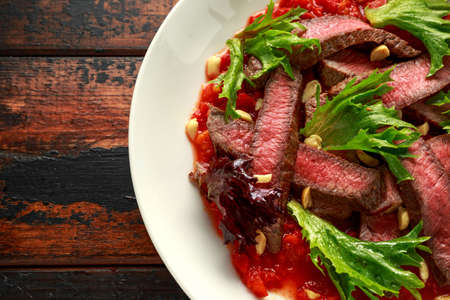 Juicy grilled steak slices served with green leaves, beetroot, and rich red sauce