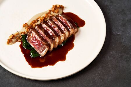Filet mignon with mashed potatoes and pomegranate sauce. Filet mignon Steak with red wine sauce on white plate on gray background with copy space, close-up
