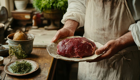 Chef Holding Raw Beef Roast, Rustic Kitchen Setting Preparing a Hearty, Traditional Meal.