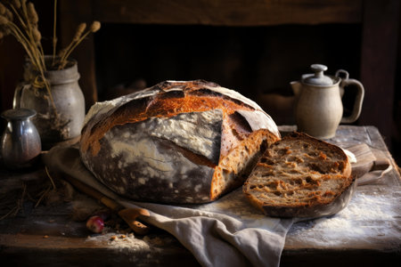 Freshly baked sourdough bread with a slice cut, on a rustic kitchen backdrop with vintage pottery