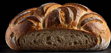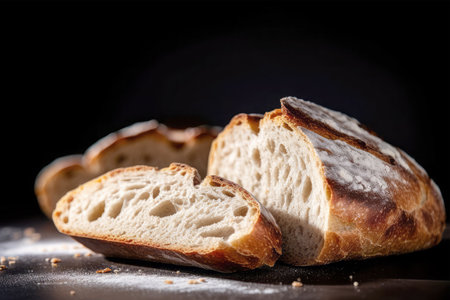 This image presents a freshly baked loaf of bread, artfully sliced to reveal its interior texture. The composition highlights the bread's golden-brown crust and airy crumb structure. The lighting appears soft, possibly natural, setting the stage for use in various culinary or food-related publications or promotional materials.