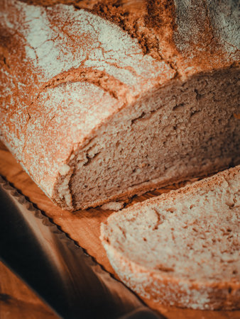 Yeast bread, whole grain rye bread. The starter is on the table. Homemade bread with natural sourdough is an organic bio-product. Handmade product, slices of bread on serving.Bread sliced on a cutting board.created with the help of artificial intelligence.
