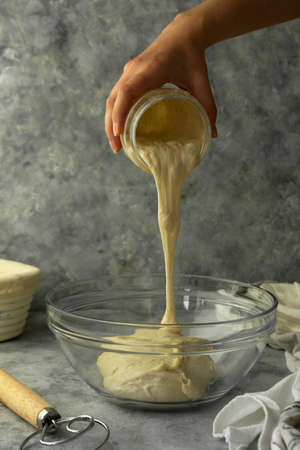 Sourdough starter. Female hands pouring active sourdough over raw dough. Cooking rustic, homemade bread