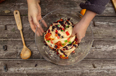 Close-up on the hand of a woman preparing a dough for homemade bread. Photo taken in the light of natural sun and studio lamps. It contains delicate artistic noise and a vintage color grading