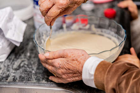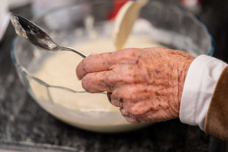 Close-up at Grandmother's hand preparing a delicious cake. Cooking time.