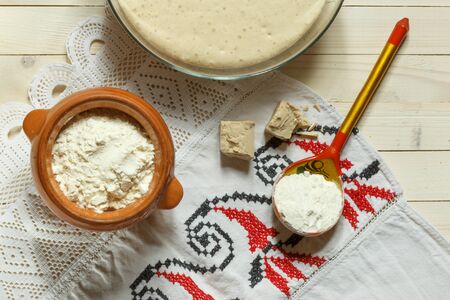 yeast dough in a bowl, a ceramic pot with flour and a wooden painted spoon on a tablecloth with embroidery, close-up