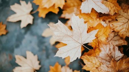 Aesthetic maple leaves, top view, autumn mood template. Generative AI.