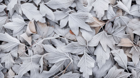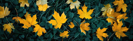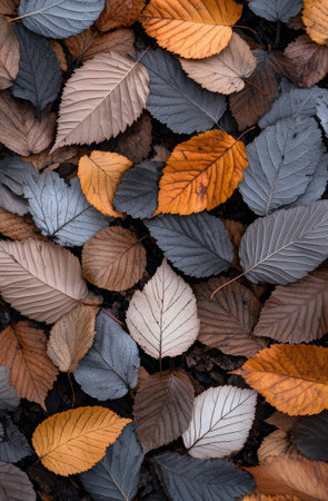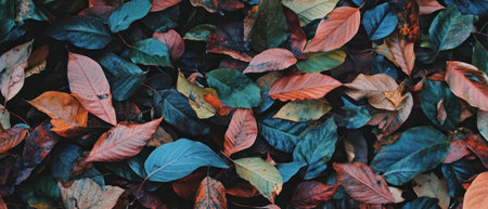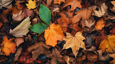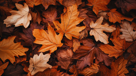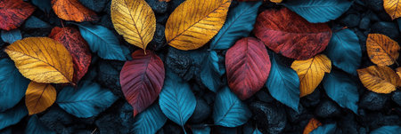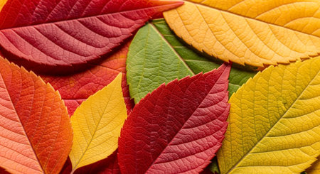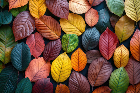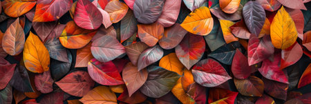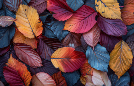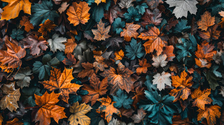 Autumn foliage display vibrant leaves in rich hues, arranged as a blanket, top view, flat lay
