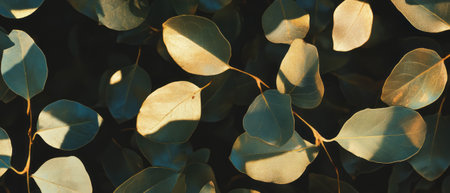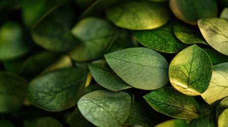 Rich green leaves are displayed in a close-up view, highlighting their smooth texture and vibrant colors under soft lighting, creating an inviting and serene atmosphere.