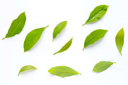 Avocado leaves on white background.