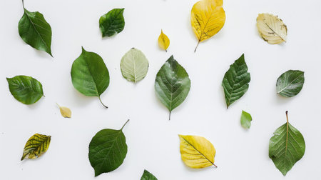 Assorted green and yellow leaves on a surface, natural texture.