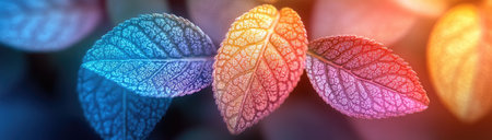 A close-up of transparent and translucent leaf veins, with delicate lines and shapes in shades of blue, purple, green, and yellow. The background is a gradient from light to dark, creating an abstract patterned texture that emphasizes the fine details on each petal, giving it depth and dimension. This design evokes nature's beauty while adding visual interest for product packaging or digital art. An ultra-realistic photograph captured using a high-resolution 3D render with a Canon EOS R5 camera and a macro lens. --ar 53:15 --stylize 750 --v 6.1 Job ID: cc75abc8-dddb-4ea7-89e6-68f48126a720
