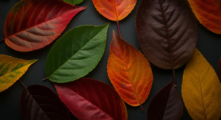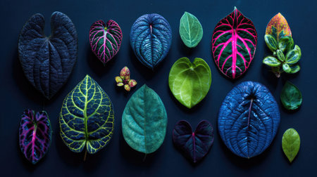 A stunning array of vibrant leaves displayed on a dark background showcases the beauty of nature. Ideal for creative projects, home decor, and artistic inspirations.