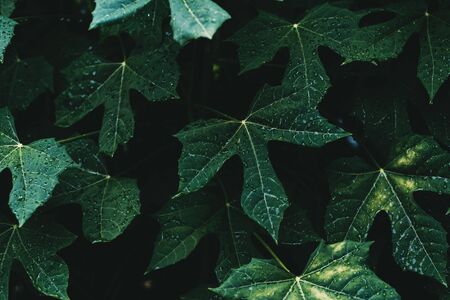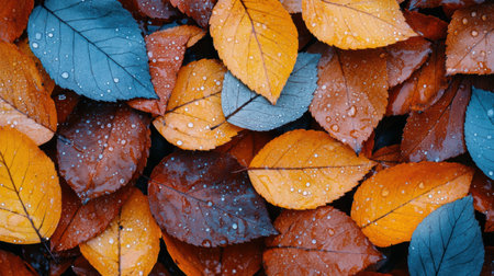 A Colorful autumn leaves with raindrops create vibrant, textured pattern