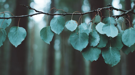 A close up macro shot of beautiful teal colored leaves on a delicate twig. The background is a softly blurred forest creating a peaceful and moody atmosphere with a shallow depth of field.