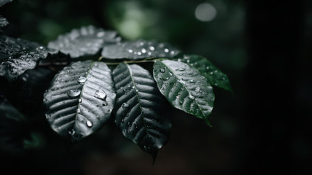 A macro photograph capturing glistening water droplets on dark, textured leaves. The background is blurred and dark, creating a mysterious and tranquil natural scene after a rain shower.
