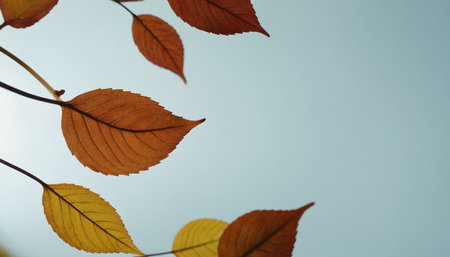 Autumn leaves on blue sky background with copy space, vintage toned