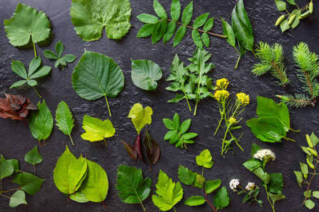 Green fresh forest tree leaves flowers are laid out on dark concrete background. Nature pattern texture for design template mockup. Floral plant wallpaper. Ecological lifestyle. Copy space for text.