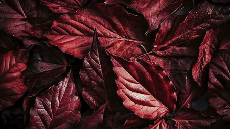 A stunning close-up of crimson autumn leaves, showing their intricate texture and deep red hues. A beautiful image representing the beauty of nature in fall.