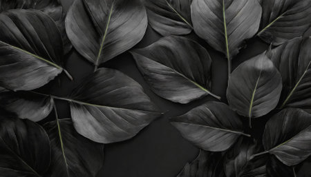 A captivating display of abstract black leaves arranged for a tropical leaf background, emphasizing dark tones and nature-inspired aesthetics in a stylish flat lay design that evokes elegance