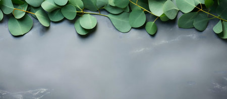 Green eucalyptus leaves arranged on gray surface. Perfect for blogs or designs.