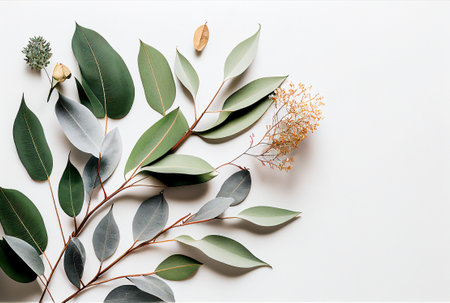 eucalyptus branch on white background, herbarium close-up, top view place for text. beautiful bokeh of plants