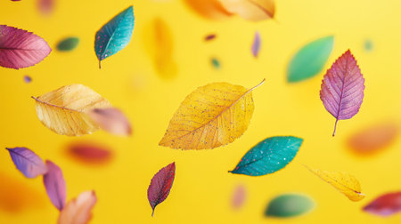 Aesthetic pastel blue, gold, purple glittering autumn leaves floating on deep yellow background. Generative AI.