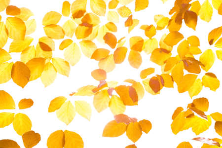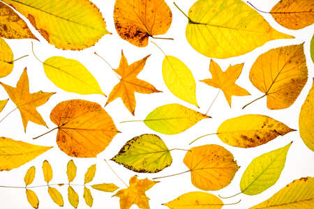 yellow leaves of a plant on a white background, photo in the light. leaves of the same size and the same plant
