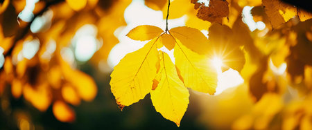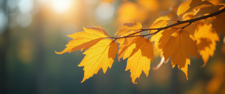 Vibrant yellow leaves glow warmly in the gentle sunlight, capturing the essence of an idyllic autumn day. The beauty of nature unfolds in a peaceful moment.