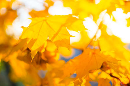 Yellow maple leaves on blue sky background, shallow depth of field.